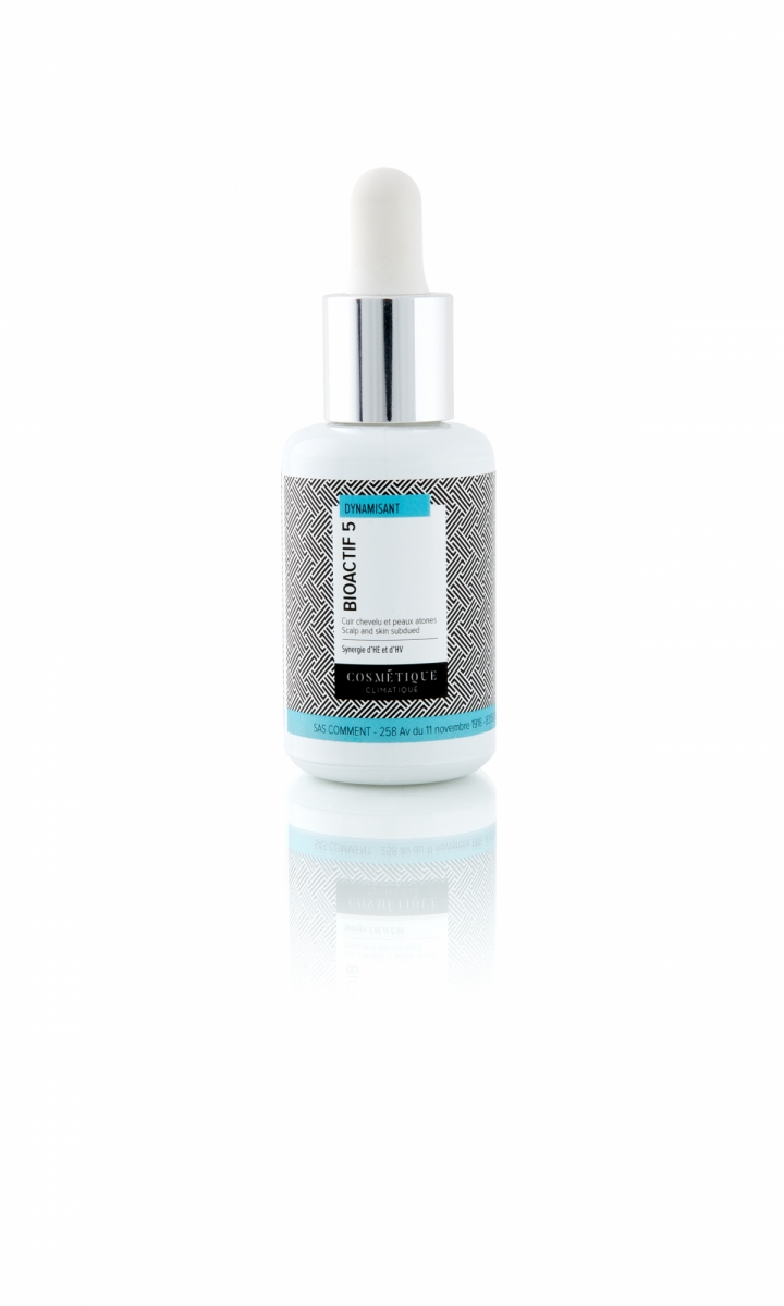 Synergie d'huiles essentielles de Bois de Hô, Orange douce, Nard, Géranium et Ylang-ylang et d'huiles végétales d'Amande, Sésame, Jojoba, Abricot, Périlla et Tournesol, participant au processus de dynamisation du cuir chevelu et de la peau et de contrôle de la chute de cheveux.